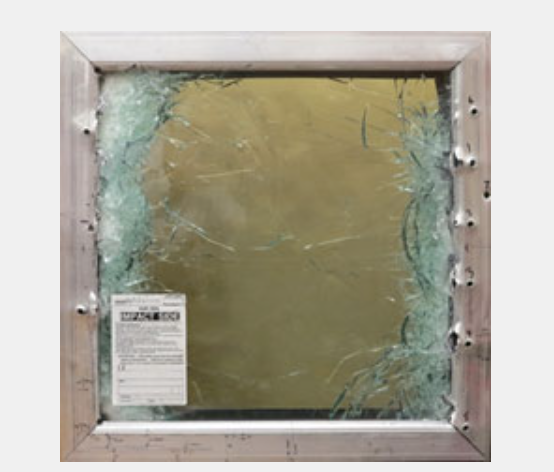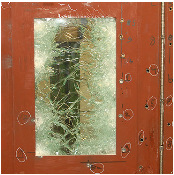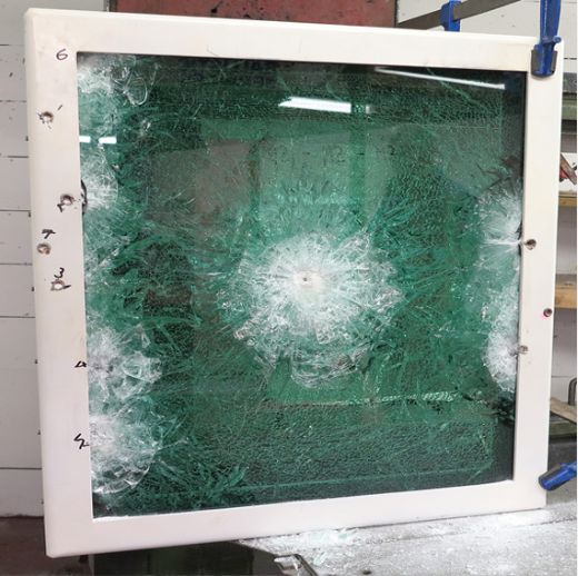 Click on the link to see high speed footage of the window framing under test. The speed has been reduced to approximately 1 frame per second and the bullet is seen to strike the window frame system and fragment.