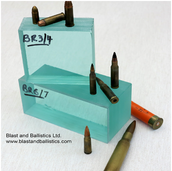 Ballistic glass, sometimes also referred to as ‘bullet glass’, is constructed of several layers of glass, PVB and sometimes with the addition of specialist polycarbonates. These layers gradually erode the penetration of the bullet when it strikes the glass. Shown below are examples of both BR4 and also BR6/7 glazing. BR4 and BR6/7 glazing references are derived from BS EN1522/23 European testing but we also supply ballistic and bullet solutions for NIJ and also UL levels of ballistic protection. UL levels up to UL 752 level 8 and also NIJ IV.
