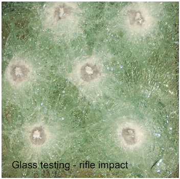 That will vary upon the protection level that is required. Generally ranging from around 24mm through to as much as 82mm in thickness. Below are images of glass that has been tested under laboratory conditions. Multiple shots within a confined area.