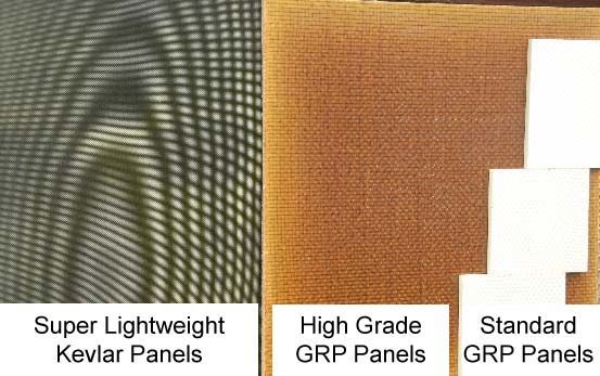 We offer a choice of super lightweight Kevlar panels, high grade GRP panels and standard GRP boards, each with different performance, weight and cost benefits. The main advantages and disadvantages of Kevlar and GRP are outlined below.