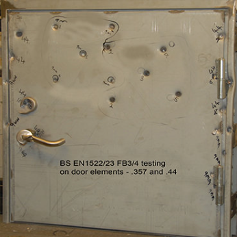 'Panel test' certification should be avoided. Some manufacturers may simply test a piece of material such as a steel plate, insert that into a hollow door and suggest that it conforms to a pre tested doorset. However Blast and Ballistics Ltd. test everything. The doorleaf, the doorframe, the hinges, the lock, the gaps between the door and frame, and also angle shots into vulnerable areas. This is why testing to EN 1522/23 is so difficult to achieve yet so reassuring for the Client.