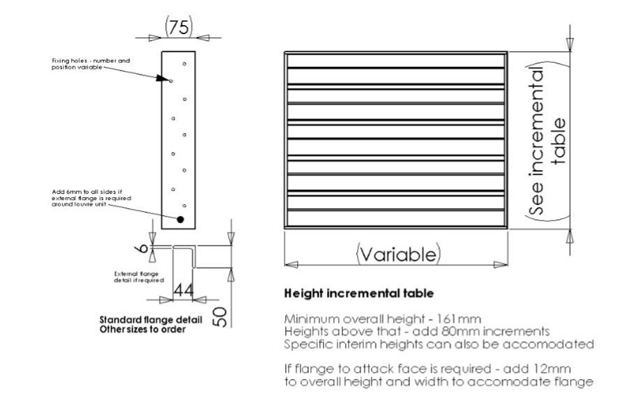 Illustration showing louver without external face fix flange detail – allow 12mm all around for flange thickness or send opening sizes with order and we will confirm.
