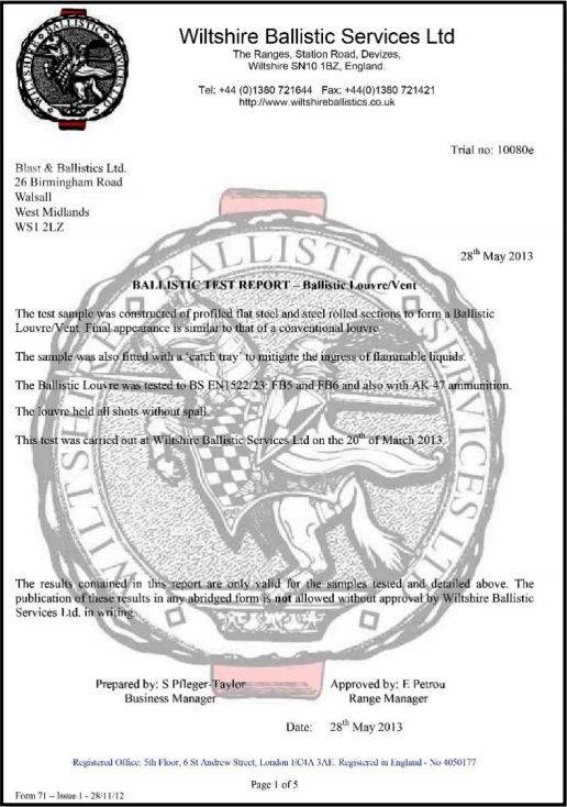 In addition, they built so as not to break apart when subjected to a blast load which would produce fragmentation. If a standard louvre collapsed under blast load there would be serious risk of injury to people and damage to property. Blast louvres are intended to prevent that from happening.