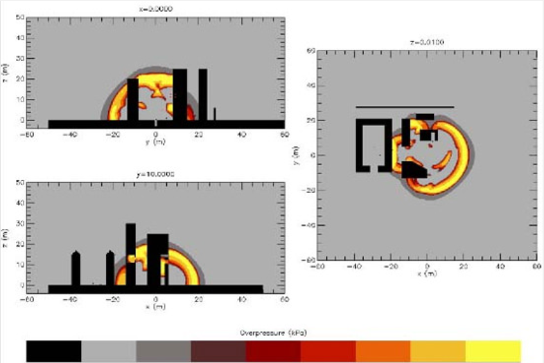 Blast window film has been a great asset as an economical method of offering enhanced blast protection to existing windows. However, it has a limited life span and a replacement program should always be considered at the actual time of installation. Computer modelling, as shown below, is a very cost effective way in which to determine if existing windows would benefit from the application of window film or if they actually need to be replaced with blast rated windows. Sometimes it is considered simply too expensive to incorporate blast mitigation into existing buildings but a cost effective computer blast effect model can produce surprisingly inexpensive methods to enhance blast protection.