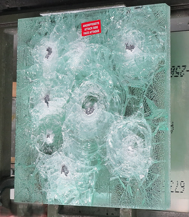 When ballistic or bullet glass is tested, it has to undergo a varying number of shots under controlled conditions. The number of shots and the spacing of the shots is dependent upon the test classification. For instance, in general terms, BS EN1063 testing requires 3 shots at 120mm spacing but an NIJ IV test would require only 1 shot. Further, EN 1063 European testing requires angle shots when the glazing unit is installed in a frame system (still attempting to find areas of weakness) whereas NIJ or UL 752 ballistic testing requires only ‘straight on’ shots.
