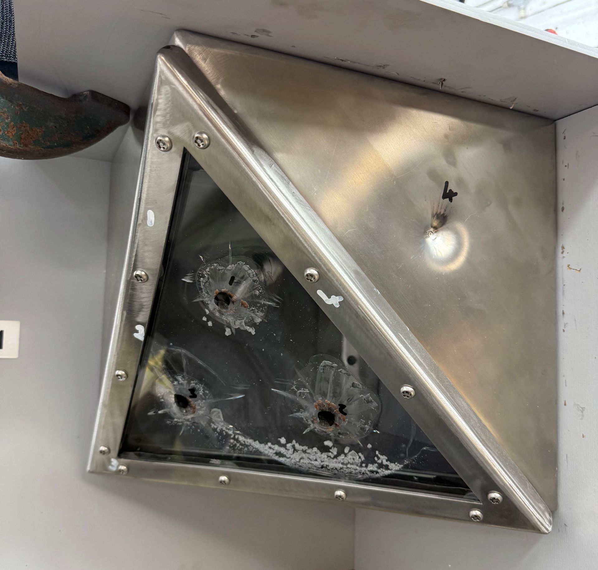 3. Evaluation: Pass requires no projectile perforation through the assembly and assess excessive deformation, joint failure, glass/rim splits, hinge/lock compromise.