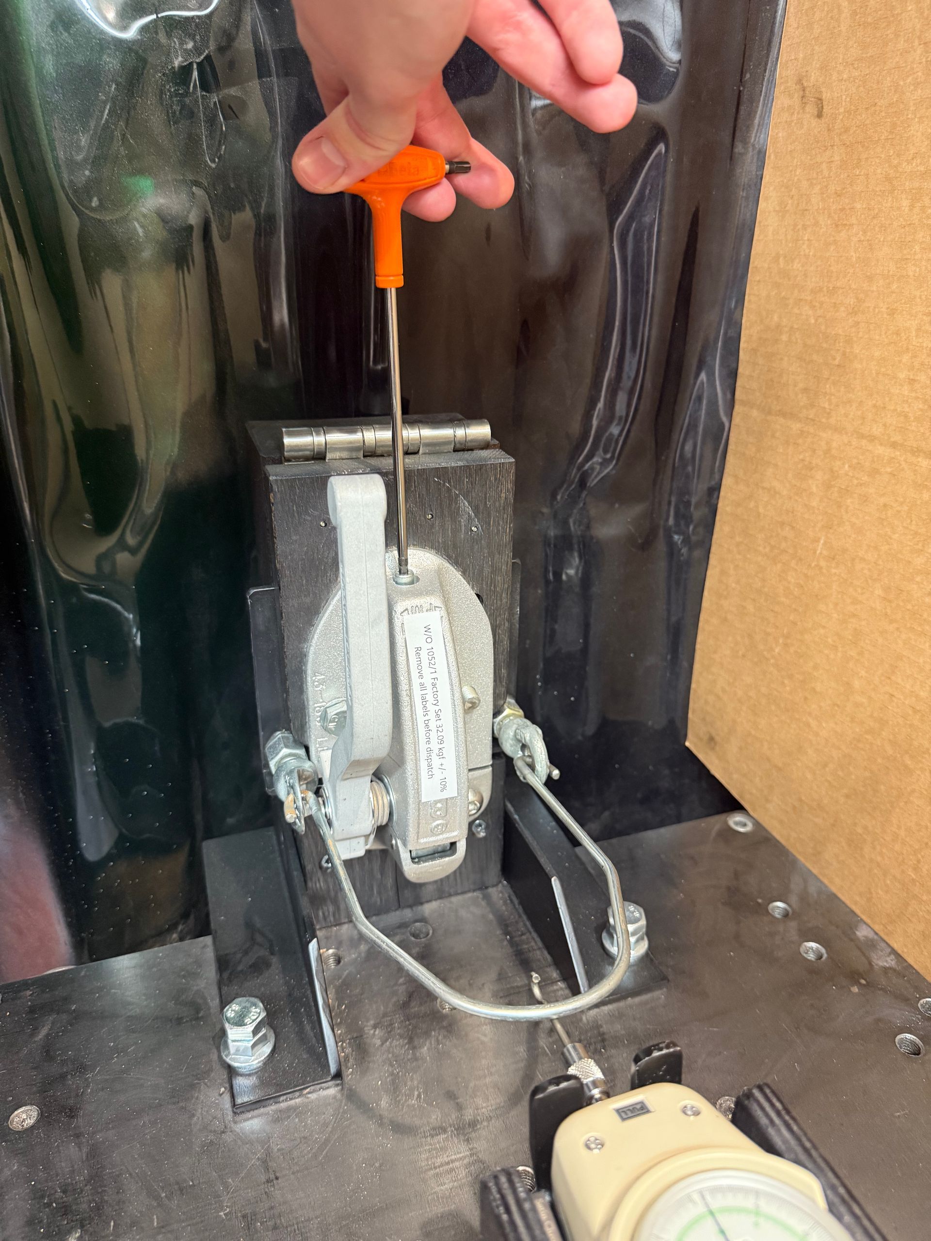 If the latch is mounted, adjustment can be made by turning the adjustment screw to its tightest position and backing off to the desired setting. Latches can be factory adjusted upon request for additional cost. For example, if you wanted 107 lbs pressure setting on a #4 latch, you tighten the adjustment screw clockwise to its maximum position. Then you would loosen the adjustment screw counter-clockwise 36 half turns {285 lbs max. - (36 x 4.935)} = 107 lbs