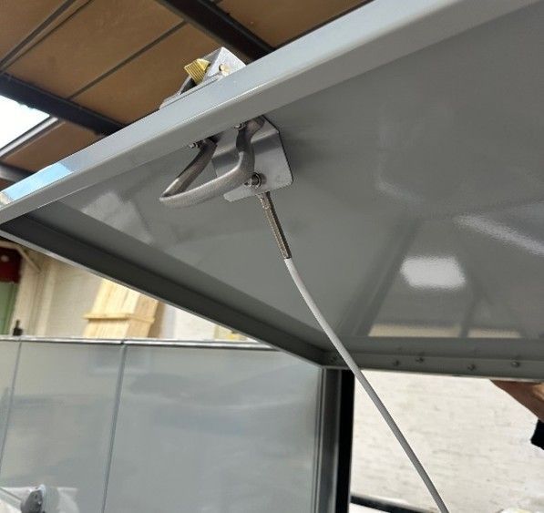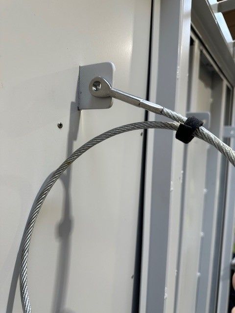 The cable restraint is fitted last, after the whole assembly has been installed into the building aperture. This is a steel wire cable wrapped in a plastic sheath to minimise scuffs and scratches to the local paint finish.