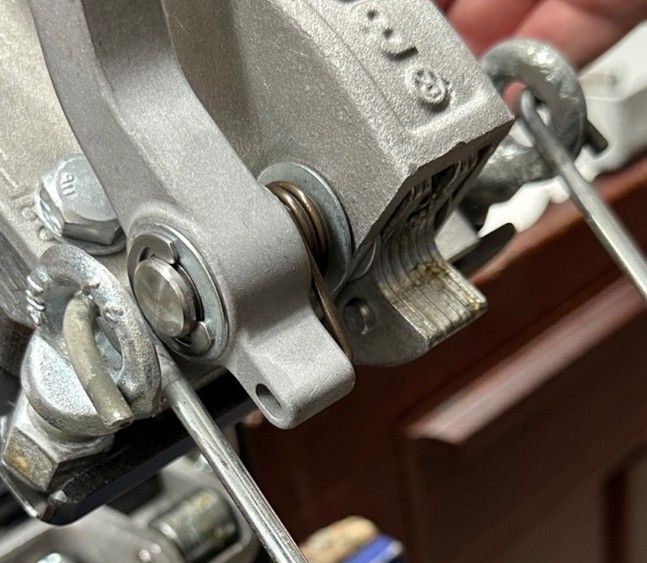 To adjust, have the latch in the door closed position (see illustration above), wherein one rivet which holds the laminated cam together is exposed.